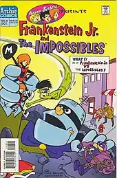 A single issue of a Frankenstein Jr. and The Impossibles comic was released by Gold Key Comics in 1966 as a tie-in to the TV series, and the contents were reprinted in The Impossibles Annual by Atlas Publishing & Distributing Co. Ltd, UK in 1968.[5] The two Frankenstein Jr. comic stories were titled "The Image Invasion" and "Frankenstein Jr. Meets the Flea Man". A new text-based story, specially written for the annual, was "A Spook in his Wheel". The character reappeared in the comic Hanna-Barbera Presents #8 published by Archie Comics in 1996. The front cover featured Frankenstein Jr. battling the Impossibles in an homage to the front cover of the original Fantastic Four #1 by Marvel Comics.