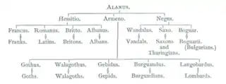 The Frankish Table of Nations (German: fränkische Völkertafel) is a brief early medieval genealogical text in Latin giving the supposed relationship between thirteen nations descended from three brothers. The nations are the Ostrogoths, Visigoths, Vandals, Gepids, Saxons, Burgundians, Thuringians, Lombards, Bavarians, Romans, Bretons, Franks and Alamanni.