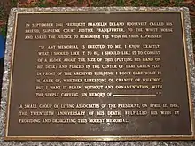 During a conversation that he had with Supreme Court Associate Justice Felix Frankfurter in 1941, Roosevelt said that if he were to have a monument in Washington, it should be in front of the National Archives and should be no larger than his desk. A 3-foot (0.9 m) tall, 7-foot (2.1 m) long, 4-foot (1.2 m) wide block of white marble was subsequently dedicated in 1965 as his memorial near the southeast corner of Ninth Street NW and Pennsylvania Avenue NW, within a lawn in front of the National Archives Building.[9] The engraved words on the memorial state: "In Memory of Franklin Delano Roosevelt 1882–1945".[10]