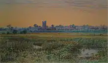 George Gordon Fraser (1859–1895), like his eldest brother Frank, showed great promise as an illustrator. His drawings and cartoons appeared in Fun magazine and he provided "upwards of one hundred and twenty illustrations" for an 1891 edition of Jerome K. Jerome's The Diary of a Pilgrimage.[7] A reprinted version of this is still available though fails to credit G.G. Fraser as the artist. He also painted, in watercolours and occasionally in oils, signing 'G. Gordon Fraser' or using his initials. William Andrew Baird Grove, in his booklet ‘The Frasers - A Local Family of Artists’ (1980) describes George Gordon’s work as - “a wide variety of Fen scenes of painstaking detail and accuracy, no longer fashionable in today’s art. His brushwork was very fine and it appears that every single twig and every leaf is given individual attention.” There are noticeably fewer examples of his work in circulation as he died young, at the age of 35, having fallen through the ice while skating on the River Ouse. He was buried with his father in a secluded spot in the graveyard of St. James’s Church, Hemingford Grey, a village between Huntingdon and St. Ives, Cambridgeshire.[2]:p54