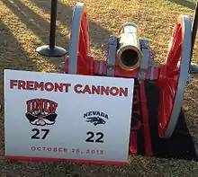 The Fremont Cannon is the trophy awarded to the winner of the Battle for Nevada (also known as the Nevada–UNLV football rivalry), an American college football rivalry game played annually by the Nevada Wolf Pack football team of the University of Nevada, Reno (Nevada) and the UNLV Rebels football team of the University of Nevada, Las Vegas (UNLV). The trophy was built in 1970 and is a replica of a 19th-century Howitzer cannon that accompanied American explorer and politician John C. Frémont on an expedition to the American West and Nevada in the mid 19th century. The original cannon had been abandoned, due to heavy snows, in the Sierra Nevada in 1843. The replica cannon was originally fired following a touchdown by the team in possession of the cannon, it has been inoperable since 1999. The wooden carriage is painted the school color of the team in possession, navy blue for Nevada or scarlet for UNLV. The trophy is the heaviest and most expensive in college football.[1] Since 2012, the game is also part of the Silver State Series (formerly Governor's Series), the series of athletic competitions between the two schools.