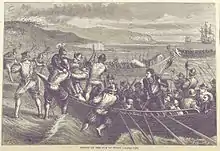 A later mention by Sir John Oglander evidently paraphrases du Bellay: "They landed at three several places at one time, purposely to divide our forces. Pierre Strosse landed at St Helens where there was a little fort, and beat our men, being divided from the fort, into the woods. Le Seigneur de Tais, General of the Foot, landed at Bonchurch, where there was a hot skirmish between them and us, and on either party many slain."[8]