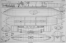 The submarine used a compressed-air engine, propelled by stored compressed air powering a reciprocating engine.[3] The air was contained in 23 tanks holding air at 12.5 bar (1.25 MPa, 180 psi), taking up a huge amount of space (153 m³/5,403 ft³), and requiring the submarine to be of unprecedented size. The engine had a power of 60 kW (80 hp), and could propel the submarine for 5 nmi (9 km), at a speed of 4 kn (7.2 km/h).