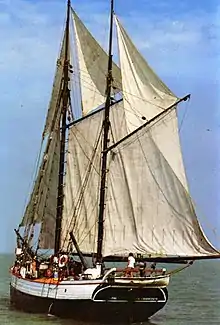 Fri was built for sail alone; she is a Baltic coastal trader constructed out of oak in 1912 in Svendborg Denmark. She is 32 meters long with a gaff rig, hand winches, and traditional ropes and canvas sails.[5] In 1969 she carried 60 tons of cargo on an historic passage between Northern Europe and San Francisco. In 1970 she carried fresh water to the American Indian activists who had seized and occupied Alcatraz Island from the Government. In 1971 under her new owners American David Moodie and his brothers, the Fri sailed from Hawaii to New Zealand crewed by a group of hippie consumer escapes, in search of adventure and an alternative lifestyle down-under. This epic voyage to New Zealand would result in the vessel and its owners carving their name in New Zealand peace history.[1][5][6]