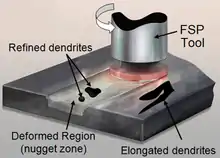 Schematic of friction stir processing. The processed metal is subjected to high strain that modifies its dendrite (grain) pattern – the dendrites are smaller and more round in the nugget zone than in the undeformed regions.[1]