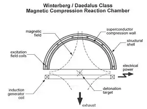 Winterberg has published numerous articles in the area of inertial confinement fusion. In particular, Winterberg is known for the idea of impact fusion and the concept of the magnetically insulated diode for the generation of multi-megampere megavolt ion beams for the purpose of heating plasmas to thermonuclear fusion temperatures. He conceived of a nuclear fusion propulsion reactor for space travel, which is called the Winterberg / Daedalus Class[20] Magnetic Compression Reaction Chamber, which was later developed at the University of Alabama at Huntsville's Propulsion Research Center. Most recently he has designed a giant spacecraft, propelled with deuterium micro-detonations ignited by a GeV proton beam, drawn from the spacecraft acting as an electrically charged up and magnetically insulated capacitor.[21] Winterberg also developed ideas for mining increasingly rare industrially crucial elements on planetary bodies such as the moon using fusion detonation devices. He became involved with the idea of using beam weapons in outer space in the late 1970s while working at the Desert Research Institute.