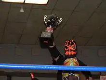 After managing to pin Crossbones in an eight-man tag team match on March 20, Mike Quackenbush suggested that Frightmare should start going after the Young Lions Cup.[23] Frightmare received his shot at the Cup on June 26, but was defeated when the champion, BDK member Tim Donst, choked him out with a necktie.[24] On August 27 Frightmare entered the eighth annual Young Lions Cup tournament, defeating Brendan Michael Thomas, who had eliminated him from the tournament the previous year, in his first round match.[25] Later that same night he defeated Christian Abel, Kaio, Amasis, Johnny Gargano and Akira Tozawa in a six-way elimination match to advance to the finals of the tournament.[25] On August 29 Frightmare defeated BDK member Lince Dorado to win the eighth Young Lions Cup tournament and score Chikara's first major victory in its war against BDK.[26] Frightmare made his first successful defense of the Young Lions Cup on September 19, defeating BDK's Pinkie Sanchez.[27] On October 23 Frightmare successfully defended the Young Lions Cup against Johnny Gargano, who cashed in his "Golden Opportunity" to get a title match.[28] The following week Frightmare made his first tour of Japan with Osaka Pro Wrestling.[29][30][31] On December 12, 2010, at the season nine finale, Reality is Relative, Incoherence aligned themselves with Hallowicked's long–time rival UltraMantis Black by saving him from Sinn Bodhi and The Batiri.[32] On March 13, 2011, Frightmare broke Max Boyer's record from 2006 for most successful defenses of the Young Lions Cup, when he defeated Batiri member Obariyon to make his sixth successful defense.[33] On April 15, Frightmare, Hallowicked and UltraMantis Black, now known collectively as the Spectral Envoy, were eliminated from the 2011 King of Trios in the first round by Team Dragon Gate (Akira Tozawa, Kagetora and Super Shisa).[34][35] On June 26, Frightmare defeated Batiri member Kodama to make his seventh and final Young Lions Cup defense.[33] On August 27, he was stripped of the title in time for the ninth annual Young Lions Cup tournament.[33] The Spectral Envoy and the Dark Army (Sinn Bodhi, Kobald, Kodama and Obariyon) faced each other in an eight-man tag team match on September 18, when the former was joined by UltraMantis Black's former Order of the Neo-Solar Temple partner Crossbones. The Spectral Envoy managed to win the match, after Ultramantis pinned Bodhi.[36] Afterwards, Frightmare was sidelined for the next eight months with an injury, before returning on May 20, 2012, during Chikara's tenth anniversary weekend.[34] On September 14, Frightmare, Hallowicked and UltraMantis Black entered the 2012 King of Trios, defeating Mihara, The Mysterious and Handsome Stranger and Tito Santana in their first round match.[34][37] The following day, the Spectral Envoy advanced to the semifinals of the tournament, after defeating their rival team The Batiri.[34] However, following the match, the Spectral Envoy was attacked by members of The Batiri and Ophidian.[38] On the third and final day of the tournament, the Spectral Envoy first defeated F.I.S.T. (Chuck Taylor, Icarus and Johnny Gargano) in the semifinals and then Team ROH (Mike Bennett, Matt Jackson and Nick Jackson) in the finals, despite interference from The Batiri, Delirious and Ophidian, to win the 2012 King of Trios.[34][39][40][41] On December 2 at Chikara's third internet pay-per-view, Under the Hood, the Spectral Envoy, represented by Frightmare, Hallowicked, UltraMantis Black and the returning Blind Rage and Crossbones, defeated The Batiri, Delirious and Ophidian in a ten-man tag team match.[34][42]