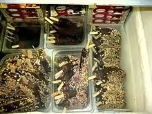 Frozen bananas are desserts made by placing a banana upon a stick, freezing it, and usually dipping it in melted chocolate or yogurt. They may be covered with toppings such as chopped nuts, sprinkles, sugar and crushed cookies.