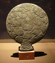 The front side, with a flat bottom and narrow, recessed edge, is undecorated. It is the back side which makes the object stand out. This surface is surrounded by a chip patterned band, even on the handle. The area inside this band is filled with a pattern of interwoven spirals. A single large spiral in the centre is connected by double strands to seven medium-sized spirals surrounding it. These seven spirals are surrounded by an outer row of fourteen yet smaller spirals. Each of the seven medium spirals are connected to two of their neighbours and to three of the spirals in the outer row. The spirals on the outer edge are each connected to their two neighbours and are formed of three or four spirals, depending on whether they are linked to one or two of the medium-sized spirals. On the handle, double and triple strands form a crisscross pattern with triangles.[2]