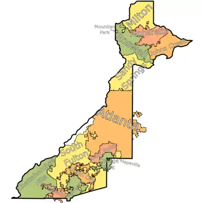 All portions of Fulton County outside of the city limits of Atlanta are served by the Fulton County School System.