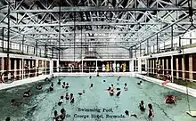 The St. George Hotel, built in 1906, with 100 rooms, was located in the town of St George.[3] Furness purchased the hotel and would eventually renovate and enlarge it, and build a new golf course.[4] The hotel also had a beach club at Achilles Bay, which is now managed by its successor, the St. Georges Club. The St. George also became known for having one of the largest indoor swimming pools in Bermuda.[2] The hotel also had a ship shaped bar building called the Sea Venture at the top of the hotel's rose walk.[5] The hotel was torn down, and today the property consists of the St. George Club while the golf course land still exists and in the process of being restored.[6]
