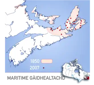 It has survived as a minority language among communities descended from Scottish immigrants[3] in parts of Nova Scotia (especially Cape Breton Island), Glengarry County in present-day Ontario, Prince Edward Island, and Newfoundland and Labrador.) The Codroy Valley on the island of Newfoundland had a Gaelic-speaking minority until the 1960s.[4]