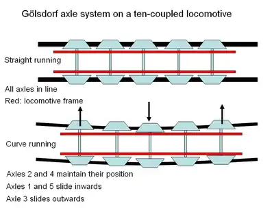 Gölsdorf axles work in this way. Two of the five axles cannot move sideways relative to the frame because their axle boxes fix them rigidly to the frame. The other axles, however, are fitted into their bearings and attached to their drives in such a way that they can be moved sideways during curve running, depending on the sideways forces acting on them. In addition the connecting and coupling rods, through which the steam pressure and linear forces from the steam pistons are translated into the rotation of the wheels via the crank pins, also have to be able to move sideways.