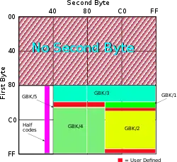 ![]() GB 18030 encoding layout. "Half codes" indicates codes used in pairs as four-byte codes. | |