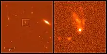 ![]() Optical afterglow of gamma-ray burst GRB 990123 (the bright dot within the white square and in the enlarged cutout) on January 23, 1999. The object above it with the finger-like filaments is its originating galaxy. This galaxy seems to be distorted by a collision with another galaxy. | |