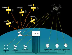 The gamma-ray burst coordinates network (GCN) is a system that distributes information about the location of a gamma-ray burst (GRB), called notices, when a burst is detected by various spacecraft. The GCN also automatically receives and distributes messages, called circulars, about follow-up observations to interested individuals and institutions. Follow-up observations may be made by ground-based and space-based optical, radio, and X-ray observatories.