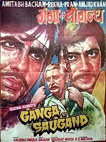 Ganga Ki Saugandh is a 1978 Hindi action drama film. Produced and directed by Sultan Ahmed, this film stars Amitabh Bachchan, Rekha, Amjad Khan, Pran, I. S. Johar, Bindu and Anju Mahendru. The music is by Kalyanji Anandji and the dialogue by Wajahat Mirza. It became a box office hit.[2]