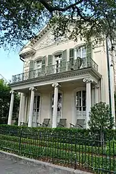 - Squires House, 2220 St. Charles Avenue, built in 1851 as one-and-half story Greek Revival residence for George Washington Squires, a commercial merchant. The house was remodeled to its present appearance in 1884 by builder James Kelly for William Renaud, a grocer and commercial merchant. In 1920, the Liberty Shop, known for its gowns and regalia for carnival royalty, began to lease the property. The House of Broel, a dress shop, began operations at Squires House in 1970.[28]