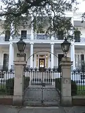 - Adam-Jones House, 2423 Prytania Street, erected for John I. Adams, merchant, who in 1860 purchased the Garden District part of the former plantation of Jacques Francois de Livaudais, built the Adam-Jones House and made it his residence until 1896. Subsequent family ownerships were Ferdinand Reusch (1896-1921), Mrs. William Preston Johnston (1921-1926), Woodruff George (1926-1961). Restored in 1961-1962 by Mrs. Hamilton Polk Jones. (Marker by New Orleans Landmarks Commission, 1995)[12]