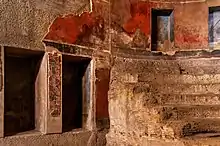 The interior wall sports seventeen niches, five along the apse and six on either side, decorated with naturalistic frescos depicting landscapes and gardens.[18] However, their correlation to the Pompeian Third Style of Roman painting makes this decoration a likely product of later renovations done by Tiberius.[19] Painting motifs evocative of the Dionysian Mysteries, such as drunken processional scenes with thyrsi and maenads prominent, match the early imperial fascination with cult initiation rites.[20]