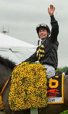 Returning to Southern California in 1984, he began winning Grade I races and rode his first Kentucky Derby on Tank's Prospect in 1985.[6] Stevens' first win in a Triple Crown race was the 1988 Kentucky Derby on the filly Winning Colors.[1] He went on to win the Kentucky Derby again in 1995 and 1997, the Preakness Stakes in 1997, 2001 and 2013, and Belmont Stakes in 1995, 1998 and 2001. He fell short of winning the Triple Crown in 1997 when he won the Derby and Preakness with Silver Charm but came in second in the Belmont. The following year, he picked up his second Belmont win on Victory Gallop, in turn denying a Triple Crown to Real Quiet.[1] In 1993 he became the youngest jockey in history to surpass the $100 million earnings mark and was the fourth youngest jockey to be inducted into the Horse Racing Hall of Fame when he was given that honor in 1997.[9]