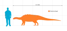 Gastonia was a medium-sized ankylosaur. In 1998, Kirkland estimated its length at six metres.[1] In 2010, Gregory S. Paul indicated a body length of five metres and a weight of 1.9 tonnes.[8] The skeleton mount is 459 centimetres long with a hip height of 112 centimetres.[7]