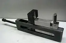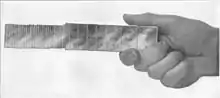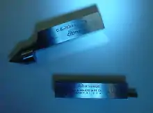 A gauge block is a block of metal or ceramic with two opposing faces ground precisely flat and parallel, a precise distance apart. Standard grade blocks are made of a hardened steel alloy, while calibration grade blocks are often made of tungsten carbide, chromium carbide or ceramic because they are harder and wear less.[2] Gauge blocks come in sets of blocks of various lengths, along with additional wear blocks, to allow a wide variety of standard lengths to be made up by stacking them. The length of each block is actually slightly shorter than the nominal length stamped on it, because the stamped length includes the length of one wring film, a film of lubricant which separates adjacent block faces in normal use. The thickness of the wring film is about 25 nanometers (0.98 μin).[3] The gauge's nominal length is also known as the interferometric length.[4]