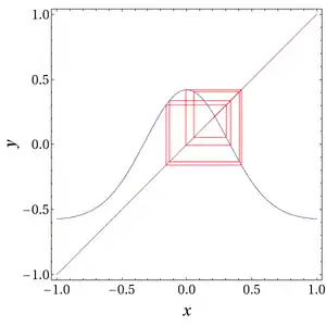![]() Bifurcation diagram of the Gauss map with and in the range −1 to +1. |