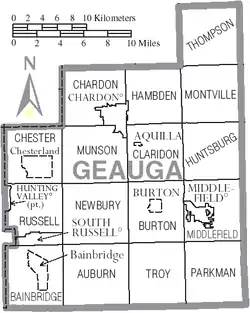 The first settlement in Geauga was at Burton, Ohio in the year 1798, when three families settled there from Connecticut.[9]