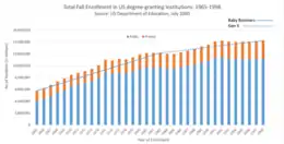 In the U.S., compared to the boomer generation, Generation X was more educated than their parents with the share of young adults enrolling in college steadily increasing from 1983 before peaking in 1998. In 1965, as early boomers entered college, total enrollment of new undergraduates was just over 5.7 million individuals across the public and private sectors. By 1983, the first year of Gen X college enrollments (as per Pew Research's definition), this figure had reached 12.2 million, an increase of 53%, effectively a doubling in student intake. As the 1990s progressed, Gen X college enrollments continued to climb with increased loan borrowing as the cost of an education became substantially more expensive compared to their peers in the mid-1980s.[99] By 1998, the generation's last year of college enrollment, those entering the higher education sector totaled 14.3 million.[100] In addition, unlike Boomers and previous generations, women outpaced men in college completion rates.[101]