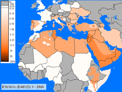 Concerning E-M123 without checking for the E-M34 SNP is found at small frequencies in Morocco A Low regional percentages for E-M123 was reported in Moroccan Berbers around 3%. E-M123 is also known as E1b1b1b2a (ISOGG 2012).