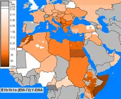 This haplogroup reaches a mean frequency of 85% in North Africa. It decreases in frequency from approximately 80% or more in some Moroccan Berber populations, including Saharawis, to approximately 28% to the east of this range in Egypt.[30][36][37]