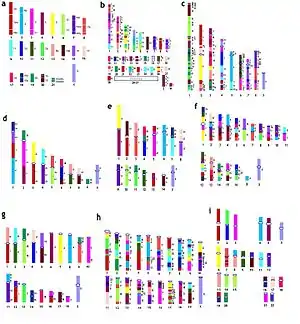 - a. Reconstructed karyotype of the ancestral Eutherian genome.[23] Each chromosome is assigned a specific color. These colors are used for mark homologies in idiograms of chromosomes of other species (5b–5i) b. Idiogram of chicken (Gallus gallus domesticus, 2n = 78) chromosomes. The reconstruction is based on alignments of chicken and human genome sequences.[24] c. Idiogram of short-tailed opossum (Monodelphis domestica, 2n = 18) chromosomes. The reconstruction is based on alignments of opossum and human genome sequences.[24] d. Idiogram of aardvark (Orycteropus afer, 2n = 20) chromosomes. The reconstruction is based on painting data.[23] e. Idiogram of mink (Mustela vison, 2n = 30) chromosomes. The reconstruction is based on painting data.[25][26] f. Idiogram of the Red fox (Vulpes vulpes, 2n = 34 + 0-8 B's) chromosomes. The reconstruction is based on painting and mapping data.[27][28] g. Reconstructed karyotype of the ancestral Sciuridae (Rodentia) genome, based on painting data (Li et al., 2004). h. Idiogram of the House mouse (Mus musculus, 2n = 40) chromosomes. The reconstruction is based on alignments of Mus and human genome sequences.[24] i. Idiogram of human (Homo sapiens, 2n = 46) chromosomes.