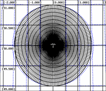 The Figure Geo warping grid depicts the solution to the problem. The circular radar coverage area is divided into a circular grid. Only the corner points of the grid are geo warped which drastically reduces the computation time. Coordinates within a grid tile are computed by a weighted bilinear interpolation of the grid corner points. As geographical projections are typically non-linear functions this introduces a certain error for the radar video display position. Keeping this error sufficiently below the radar measurement resolution makes sure that this is no restriction for the radar video display quality. The grid tile size has to be computed once for a radar position and a given projection. Thus, the grid is typically computed once for a static radar and only more often for moving radars such as on ships.