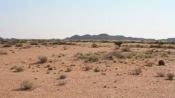 Bushmanland is an arid area inland from Namaqualand (see below). Its northern boundary is the Orange River beyond which lies Namibia. In the south it grades into the north-western part of the Great Karoo. To the west lies Griqualand West. It is probably the most inhospitable area in South Africa, because of its aridity, infertile soil and highly saline groundwater. Together with the Kalahari Desert to the north-east, its rainfall is the most highly variable (in percentage deviation from the annual average), and its temperature range the greatest (difference between the average temperature in January and in July) in South Africa.[10] Its wildlife however, both fauna and flora, though sparse, is full of interest. Although the veld is too arid to bloom like that of the West Coast of Namaqualand, even when there is some spring rain, what does appear is highly unusual and often hauntingly beautiful.