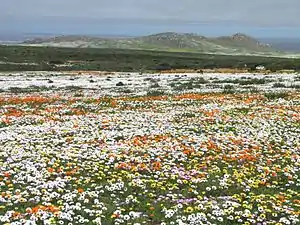 Namaqualand is popular with both local and international tourists during early springtime (August - September), when for a short period this normally arid area becomes covered with a kaleidoscope of colour during the flowering season. This is known throughout South Africa as the Namaqualand daisy season, when orange and white daisies, as well as hundreds of other flowering species, spring up from a previously barren landscape.[12] A part of Little Namaqualand, known as the Richtersveld, is a national park and a World Heritage Site, while the often-visited Namaqua National Park and the Goegap Nature Reserve are located short distances from Kamieskroon and Springbok, respectively.