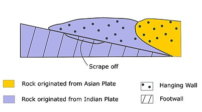 Crustal materials of Himachal Pradesh were emplaced to the present position in response to the collision between the Indian and Asian continents. As collision proceeds, rocks are shortened and absorbed by subduction,[21] thrusting and erosion.[4] A portion of crust has been recycled to the mantle by subduction and slab break-off. The two colliding blocks have been rubbing against each other. Materials from the Indian Plate were scraped off by the Asian Plate. Both Indian and Asian sourced rocks were accumulated and piled up to form a thrust wedge (Fig. 4).