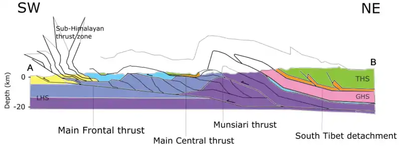 - Out of sequence faulting — The Munsiari thrust as the out-of-sequence thrust was developed recently from the Himalayan sole thrust.[14] It truncated the Main Central thrust in this area.[13]