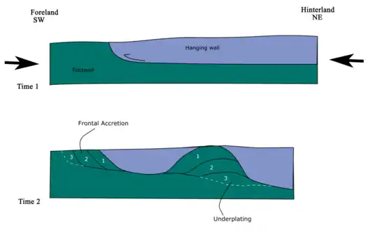 - Underplating — Rock units are thrust and piled up section by section (Fig. 5). At the middle part of the thrust wedge, the Lesser Himalayan Sequence started to develop thrust horses and antiformal stacks at depth since 5.4Ma.[13]