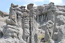 Basal conglomerate in the Demir Kapija area are overlain by massive limestones from the Tithonian. Ophiolite-gabbro cumulates are identified as oceanic-type gabbros and basalts are believed to have formed from up to 20 percent pre-existing crustal rock. Among the acidic magmatic intrusive bodies in the area are granites and granodiorites. In the west, in the vicinity of Korab Mountain, is a limestone formation with layers of chert and a flysch formation dominating the sub-soil, made up of claystone, limestone and siltstone. Toward the south is an additional ophiolite complex with similar rocks to the Vardar Zone.