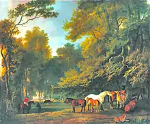 Barret often worked with other artists, particularly when depicting animals. The Lowther painting of Knipe Scar included dogs that were painted by George Stubbs and the sportmen by Philip Reinagle and a painting sold in 1802 had figures attributed to Francis Wheatley.[46]
