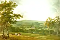 A further Irish patron of Barret was the Thomas Conolly of Castletown House of Celbridge to the west of Dublin. He inherited Castletown House in 1758 and his wife Lady Louisa Conolly (who was the daughter of Charles Lennox, 2nd Duke of Richmond), set about redecoration and refurbishment of this Palladian mansion. Barret supplied a painting of the house in the distance with wooded parkland and a river. The trees are depicted in outline and not in Barret's later spindly way. John Harris remarks that it is softly and atmospherically painted, and of course, is free from the influence of Wilson and other London based painters.[15] As he could not find adequate employment in Ireland, Barret moved to London in 1762.[16]