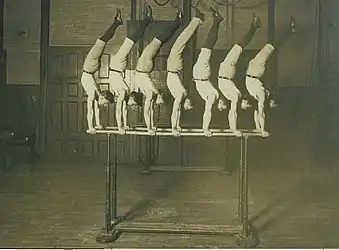 George Louis Eyser (August 31, 1870 – March 6, 1919) was a German-American gymnast who competed in the 1904 Summer Olympics, earning six medals in one day, including three gold and two silver medals.[1] Eyser competed with a wooden prosthesis for a left leg, having lost his leg after being run over by a train. Despite his disability, he won gold in the vault, an event which then included a jump over a long horse without aid of a springboard.[2][3]