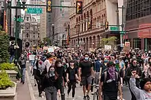 Protests began outside Philadelphia City Hall at noon. At City Hall, protestors knelt and engaged in nine minutes of silence, referencing the amount of time Chauvin knelt on Floyd's neck.[12] At around 1 p.m., protestors marched from City Hall to the Philadelphia Museum of Art for a planned 2 p.m. demonstration.[13]