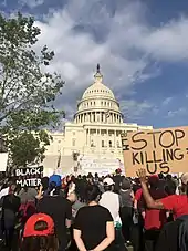 One group of protesters marched a route through the city, with National Guard troops and federal agents monitoring. Barricades had been erected around certain areas of the capital and were maintained by Capitol Police. The names of those who had died in previous police encounters were read aloud, and protesters had demonstrated in front of the Capitol building and the Trump International Hotel. In the evening protesters gathered in Lafayette Park or staged a die-in on Pennsylvania Avenue for about eight minutes chanting, "I can't breathe".[35]