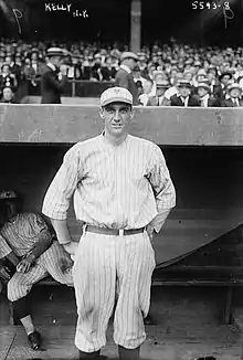 Kelly began his professional career for the Victoria Bees of the Class-B Northwestern League in 1914 and 1915.[7] During the 1915 season, he was purchased by the New York Giants from Victoria for $1,200 (equal to $30,328 today).[1] The Giants were rebuilding their team, and they saw Kelly as a possible replacement for Fred Merkle.[2] However, he played sparingly for the Giants in his first MLB seasons, appearing in only 17 games in 1915 and 49 games in 1916. He was selected off waivers by the Pittsburgh Pirates on July 25, 1917 to back up Honus Wagner, but did not hit sufficiently.[2] The Pirates waived Kelly, and he was reclaimed by the Giants from the Pirates on August 4, 1917.[1] The Giants optioned Kelly to the Rochester Hustlers of the Class-AA International League, where he played the rest of the 1917 season.[7] Kelly did not play professionally in 1918 due to his military service.[2] The Giants sold Kelly to Rochester before the 1919 season to acquire Earl Smith.[8][9]