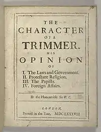 Halifax's influence, both as orator and as writer, on the public opinion of his day was probably unrivalled. His intellectual powers, his high character, his urbanity, vivacity and satirical humour made a great impression on his contemporaries, and many of his witty sayings have been recorded. Maintaining throughout his career a detachment from party, he never acted permanently or continuously with either of the two great factions, and exasperated both in turn by deserting their cause at the moment when their hopes seemed on the point of realisation. To them he appeared weak, inconstant, untrustworthy. But the principle which chiefly influenced his political action, that of compromise, differed essentially from those of both parties, and his attitude with regard to the Whigs or Tories was thus by necessity continually changing. Thus the regency scheme, which Halifax had supported while Charles still reigned, was opposed by him with perfect consistency at the revolution. He readily accepted for himself the character of a "trimmer," desiring, he said, to keep the boat steady, while others attempted to weigh it down perilously on one side or the other; and he concluded his tract with these assertions: "that our climate is a Trimmer between that part of the world where men are roasted and the other where they are frozen; that our Church is a Trimmer between the frenzy of fanatic visions and the lethargic ignorance of Popish dreams; that our laws are Trimmers between the excesses of unbounded power and the extravagance of liberty not enough restrained; that true virtue hath ever been thought a Trimmer, and to have its dwelling in the middle between two extremes; that even God Almighty Himself is divided between His two great attributes, His Mercy and His Justice. In such company, our Trimmer is not ashamed of his name. . . ."