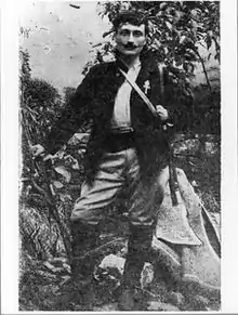 Georgios Tombras was born in the then mostly Greek-speaking Asia Minor city of Kydonies (also known as Aivali, present-day Ayvalık). He was commissioned a lieutenant and served in the Greek Army as a pharmacist. He went to Macedonia in 1905 as a secretary in the detachment of Stavros Rigas ("Captain Kavodoros"),[1] later he was with rebel Georgios Katechakis ("Captain Rouvas") in Kastoria. In September 1906 he was the lieutenant of Konstantinos Saros during the fighting at Giannitsa Lake. Later that year he returned to Greece, according to sources, after entering into a serious dispute with Saros.[2]