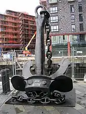 Blücher was ordered by the Kriegsmarine from the Deutsche Werke shipyard in Kiel.[4] Her keel was laid on 15 August 1936,[9] under construction number 246.[4] The ship was launched on 8 June 1937, and was completed slightly over two years later, on 20 September 1939, the day she was commissioned into the German fleet.[10] The commanding admiral of the Marinestation der Ostsee (Baltic Naval Station), Admiral Conrad Albrecht, gave the christening speech. Mrs. Erdmann, widow of Fregattenkapitän (Frigate Captain) Alexander Erdmann, former commander of SMS Blücher who had died in the ship's sinking, performed the christening.[11] As built, the ship had a straight stem, though after her launch this was replaced with a clipper bow increasing the overall length to 205.90 meters (675.5 ft).[3] A raked funnel cap was also installed.[12]
