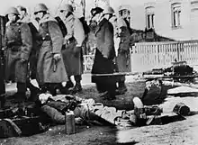 At about 07:50 on the southern outskirts of Haderslev, a Danish 37 mm anti-tank gun with a crew of five attacked the approaching armour.[18] Two German tanks lined up adjacent to one another and opened fire. The Danes landed all three of their shots—one in a tank's tracks—but two of the gun crew were killed and the rest wounded. One tank then drove over the gun. Around the curve on Sønderbro Street, two 20 mm cannon and a machine gun put up resistance at the wagon roadblock on Sønderbro Street. The Germans laid down heavy fire. A Danish soldier was killed and two were wounded, but the Germans were effectively pinned down.[19] The fighting continued for ten minutes until the order to surrender was received from Copenhagen by telephone. The Germans were then allowed to proceed into Haderslev, but the Danish garrison stationed there had not received the order to surrender and fired on them. Two German tanks and a motorcycle proceeded unsuspecting towards the barracks, which were defended by the anti-tank unit from Lundtoftbjerg.[13] They opened fire, killing the motorcyclist and blowing the tracks off one tank, sending it crashing into a house. However, the Danish garrison capitulated at 08:15 when the order to surrender finally came through.[13] One Danish soldier was killed while defending the barracks,[13] and three civilians were killed in the crossfire.[20]